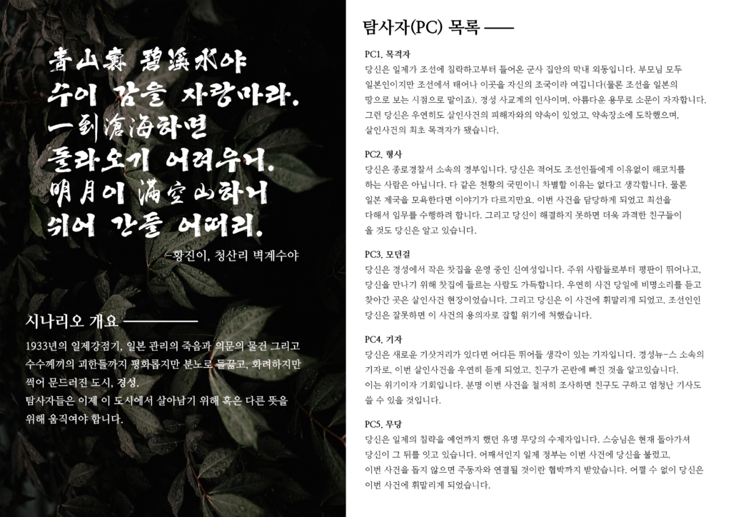 당신은 일제가 조선에 침략하고부터 들어온 군사 집안의 막내 외동입니다. 부모님 모두 일본인이지만 조선에서 태어나 이곳을 자신의 조국이라 여깁니다(물론 조선을 일본의 땅으로 보는 시점으로 말이죠). 경성 사교계의 인사이며, 아름다운 용무로 소문이 자자합니다. 그런 당신은 우연히도 살인사건의 피해자와의 약속이 있었고, 약속장소에 도착했으며, 살인사건의 최초 목격자가 됐습니다.