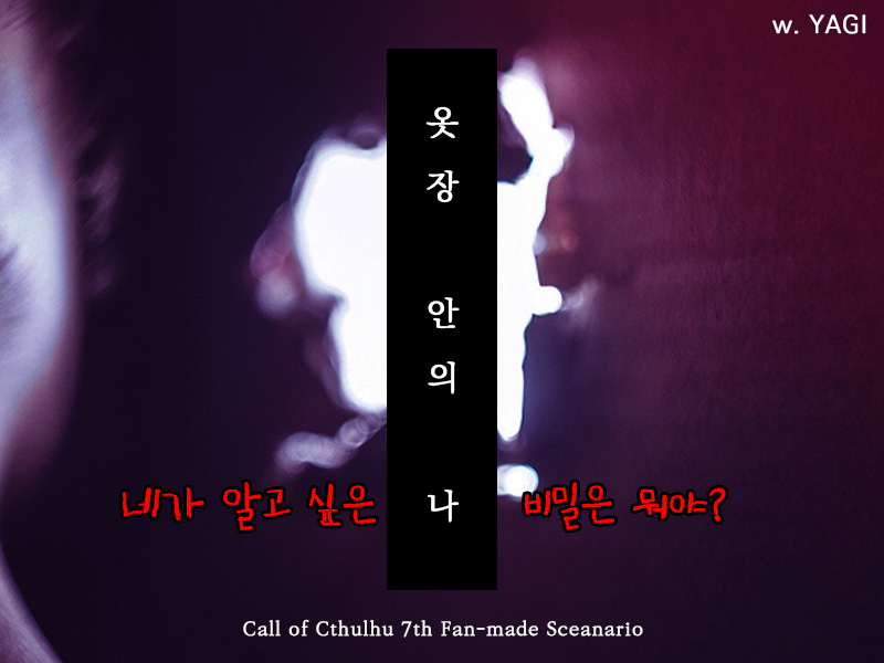 한국형 크툴루인‘영산군 시리즈’ 중 한 편입니다. 경남 영산군의 한 고등학교에서는 최근 괴담 하나가 유행하고 있습니다. ‘옷장 안의 나’라는 괴담으로 밤 12시, 옷장 문을 열어두고 자면 ‘옷장 안의 또 다른 나’가 어떤 질문에라도 답해준다고 해요. 탐사자들은 KPC의 집에 모여 괴담을 실험해봅니다.