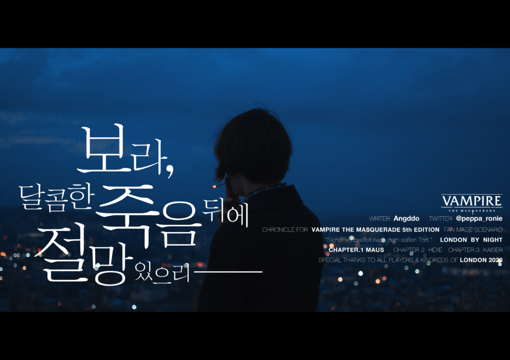 ※뱀파이어 더 마스커레이드 5판 팬메이드 시나리오 “보라, 달콤한 죽음 뒤에 절망있으리” 는 우리의 세계를 어둡게 반영시킨 공포 픽션 장르의 룰/시나리오 입니다. 즉, 이 룰과 시나리오 내에선 피를 마시는 행위, 마약, 성행위, 폭력, 괴롭힘, 정치적 탄압 및 강압, 오컬트주의, 반란의 이야기, 소중한사람의 상실과 같이 논란의 여지가 있는 주제가 포함되어있을 수 있습니다. 만약, 플레이 도중 힘들어진다면 잠시 세션을 멈추고 쉬는 시간을 갖거나 조율하고, 의논하세요. 이 룰은 모든 플레이어들과 스토리텔러들에게 성숙한 판단을 요구합니다.